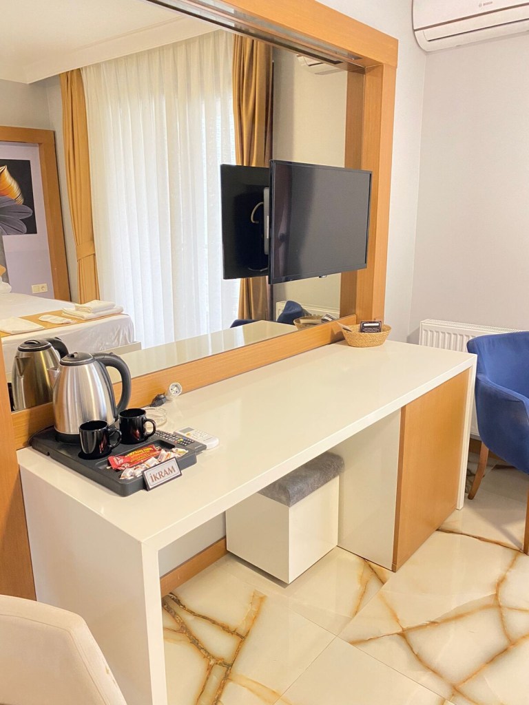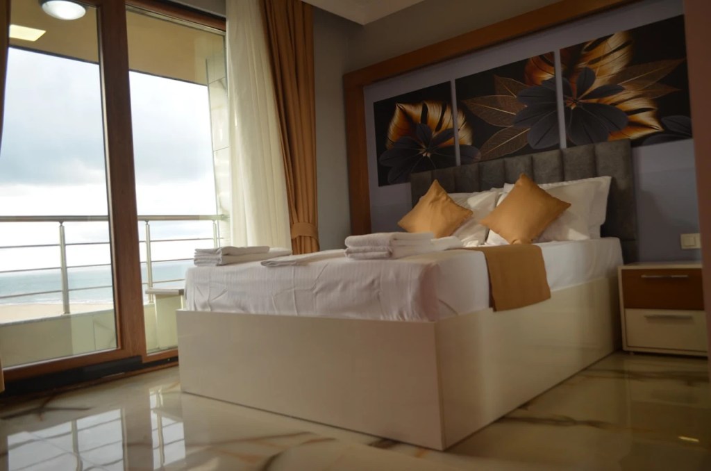 Deniz manzaralı odalarımızda ortopedik yataklar, klima, hızlı Wi‑Fi, minibar, akıllı TV ve çalışma alanı ile konforlu ve huzurlu bir konaklama sunuyoruz.